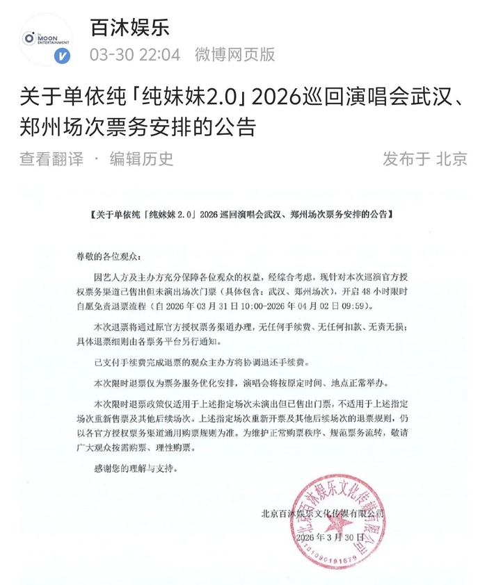 3月30日晚,单依纯“纯妹妹2.0”巡演主办方发布公告,经综合考虑,针对武汉、郑州两站已售出门票,开启48小时限时自愿免责退票通道,无任何手续费、无任何扣款。
