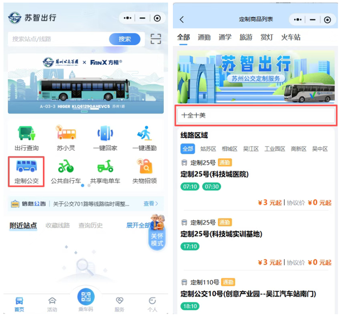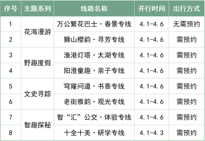 8条专线中,万公繁花巴士·春景专线无需预约,其余7条线路均需通过“苏智出行”微信小程序预约,满15人即可成团发车。有需要的小伙伴可进入小程序后点击“定制公交”,搜索线路名称即可购票乘车,凭码核销。