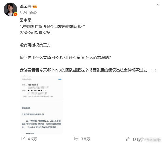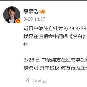 3月29日,歌手李荣浩与单依纯因演唱会翻唱歌曲的授权问题引发热议。李荣浩发文称,单依纯方曾致电“中国著作权协会”和“我方版权公司”,征求授权在其演唱会中翻唱《李白》,在“我方明确婉拒”的情况下“强行侵权演唱”。