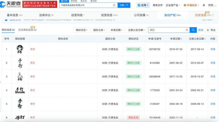 据天眼查知识产权信息显示,今麦郎食品股份有限公司在2004年到2023年间陆续注册了多个“手打”字样的商标,属于方便食品系列。
