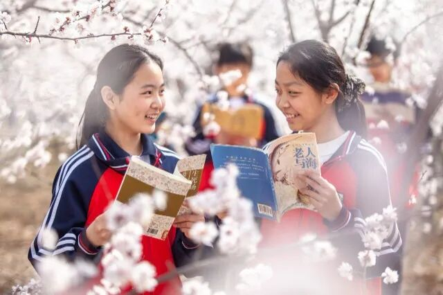 学生们在杏花树间读书。中国教育报-中国教育新闻网通讯员张维堂 摄