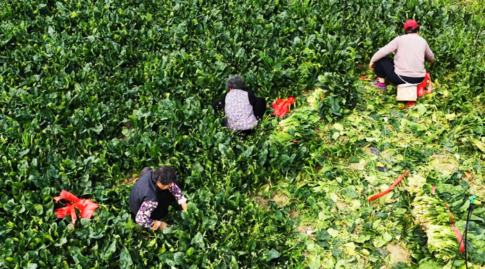 3月31日上午,在太和县芙蓉家庭农场,50多名村民正手持铲子、镰刀等工具采收菠菜。去杂、剔黄、捆扎、装车,一道道工序有条不紊。农场负责人康启顺的手机响个不停,忙着对接客户和货车司机。