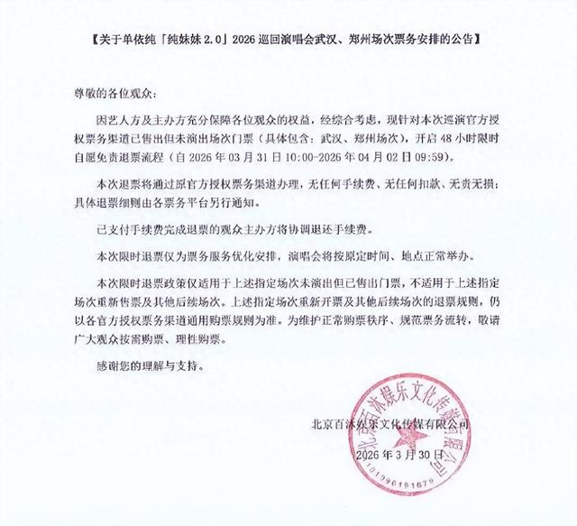 3月30日,单依纯本次巡演的主办方北京百沐娱乐文化传媒有限公司@百沐娱乐 发布“关于单依纯「纯妹妹2.0」2026巡回演唱会武汉、郑州场次票务安排的公告”,表示为保障观众权益,武汉站与郑州站开启48小时限时自愿免责退票。