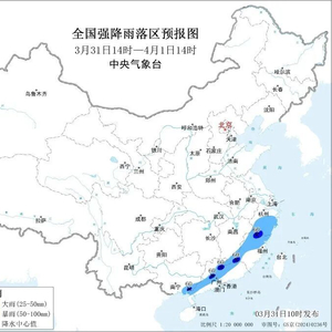 预计,3月31日14时至4月1日14时,江西南部、浙江南部、福建北部和西部、广东中西部和东北部、广西东南部等地部分地区有大雨,局部地区有暴雨。上述部分地区伴有短时强降水,局地有雷暴大风等强对流天气。