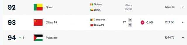 赛后国际足联排名的最新变化,喀麦隆队排第44,国足是第93位。