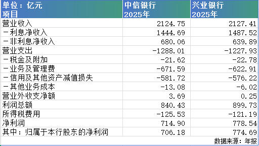 年报显示,中信银行(601998.SH,00998.HK)和兴业银行(601166.SH)2025年营业收入分别为2124.75亿元和2127.41亿元,兴业银行仅高出2.66亿元,但最终的归属净利润,兴业银行却高出了68.51亿元。