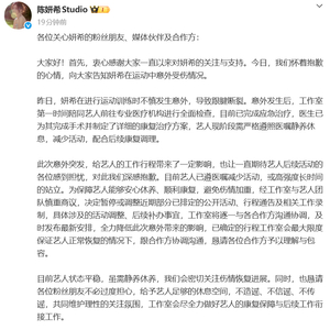3月31日,陈妍希工作室发文表示,陈妍希在进行运动训练时不慎发生意外,导致跟腱断裂,目前已完成应急治疗,医生已为其完成手术并制定了详细的康复治疗方案。