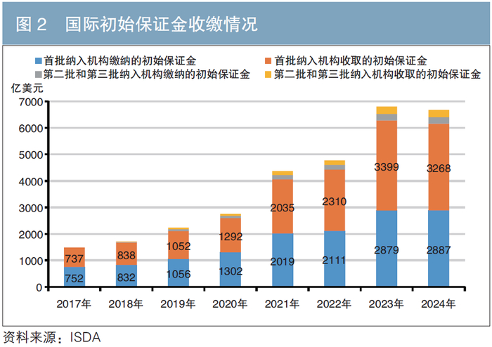 场外衍生品强制保证金制度实施以来,全球场外衍生品市场规模逐年扩大,截至2024年末,场外衍生品合约名义本金余额接近700万亿美元(见图1),全球场外衍生品市场保证金规模也同步迅速增长。根据国际掉期和衍生工具协会(ISDA)披露的数据,初始保证金规模已从2017年的1489亿美元增长至2024年的6674亿美元,年均增长率达49.8%(见图2)。