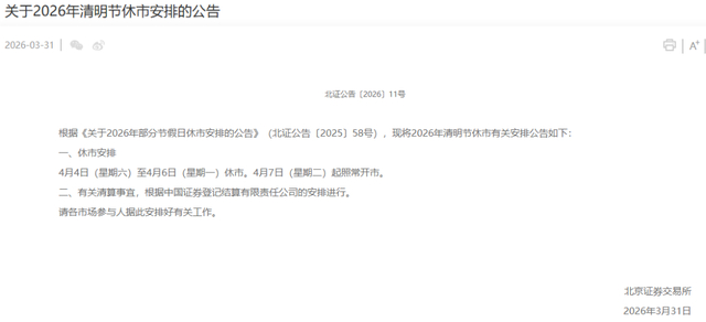 上交所、深交所、北交所3月31日公布2026年清明节休市安排:4月4日(星期六)至4月6日(星期一)休市,4月7日(星期二)起照常开市。