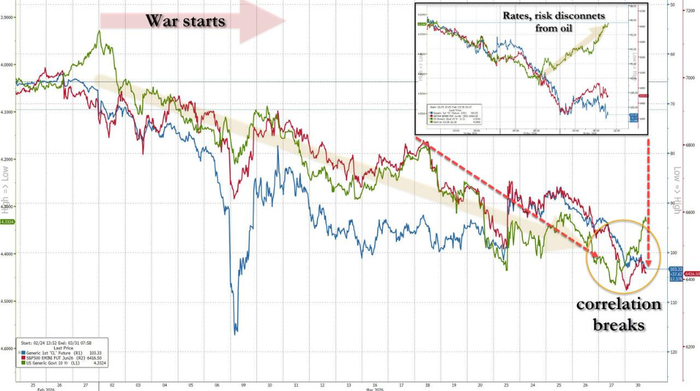 这一组合走势极为罕见——据摩根大通,这是伊朗冲突爆发以来首次,也是今年仅第二次出现能源股与大盘股同步下跌、而债券与黄金同步上涨的局面。