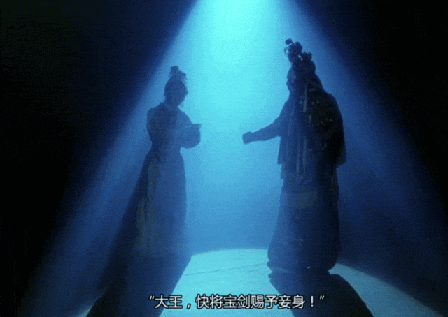 程蝶衣站在台上,穿着虞姬的戏服,拔出那把剑,说完“大王,快将宝剑赐予妾身”,随后剑抹过脖子,人倒下去。