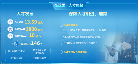 (五)人才集聚:人才供给充足,全市有57所高校、341所中职校,年毕业生超38万;另有800万农民工(含400万沿海待回流人员)。长寿区内3所高职院校可定向培养化工、制药等专业人才,且经开区已拥有10万稳定产业工人,能充分匹配产业用工需求,为产业发展提供坚实人才支撑。