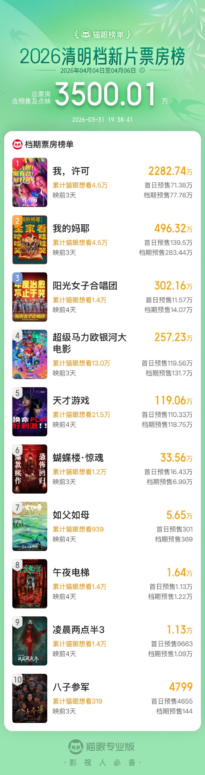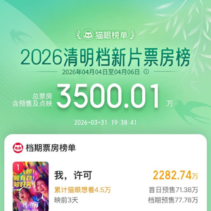 2026清明档新片预售票房破3500万 界面新闻 界面新闻官方账号 03月31日19:50 关注 听新闻 据猫眼专业版数据,截至3月31日19时38分,2026年清明档新片预售总票房破3500万,《我,许可》《我的妈耶》《阳光女子合唱团》暂列清明档新片预售票房榜前三位。