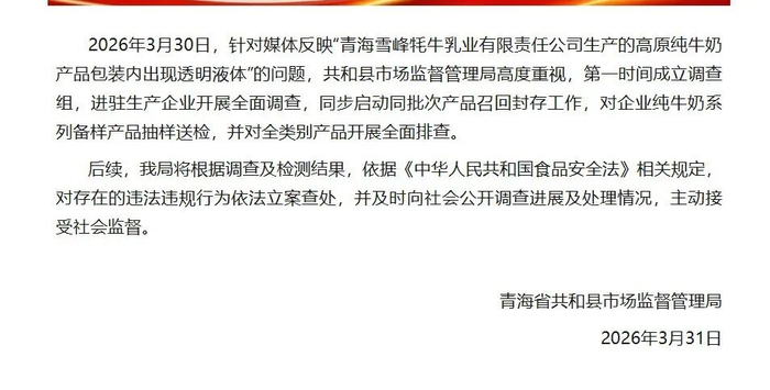 3月30日,针对媒体反映“青海雪峰牦牛乳业有限责任公司生产的高原纯牛奶产品包装内出现透明液体”的问题,共和县市场监督管理局高度重视,第一时间成立调查组,进驻生产企业开展全面调查,同步启动同批次产品召回封存工作,对企业纯牛奶系列备样产品抽样送检,并对全类别产品开展全面排查。