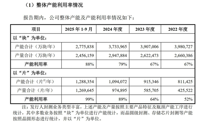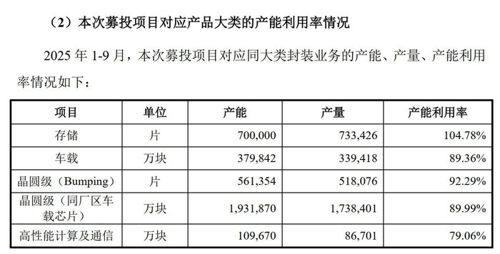 通富微电公告显示,2025年1—9月,通富微电总体产能利用率高达88%,而以晶圆形态统计的产能利用率更是达到99%。细分至本次募投对应的产品大类,存储芯片封测产能利用率达到104.78%,晶圆级产能利用率达到92.29%。