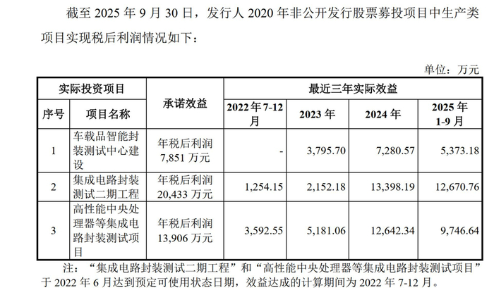 从具体数据来看,“集成电路封装测试二期工程”原本预计的年税后利润约2亿元,但在2022年7月至12月投产初期仅实现1254.15万元利润,2023年全年也仅为2152.18万元。同样,“车载品智能封装测试中心建设”项目预计年税后利润为7851万元,但实际在2023年和2024年分别实现3795.7万元和7280.57万元利润,均未达到预期基准线。“高性能中央处理器等集成电路封装测试项目”的预计年税后利润约1.39亿元,而该项目在2023年和2024年分别实现约0.52亿元和1.26亿元利润。