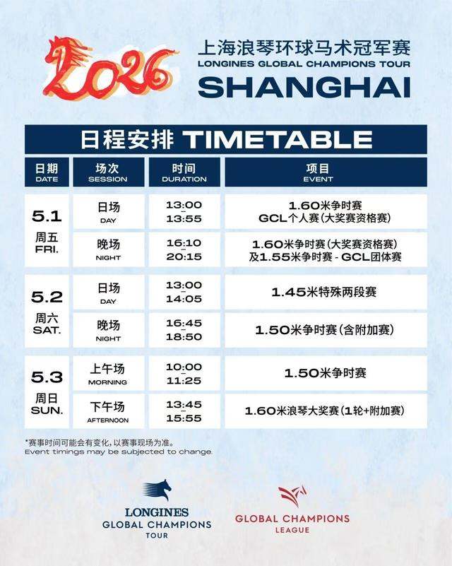今年,赛事在赛程设置上进一步优化:不仅在首个比赛日新增一场1.60米GCL(环球团体冠军赛)个人赛作为重头戏浪琴大奖赛资格赛之一,提高了赛事的竞技性和观赏性;还依旧分日场、晚场举行,既能满足了多元化的观赛需求,又能呈现全天候观赛场景。多类型赛制交替上演、顶尖人马组合同场竞技,当高潮汇聚5月3日下午备受瞩目的1.60米浪琴大奖赛,全球观众将共同见证黄浦江畔的又一荣耀时刻。