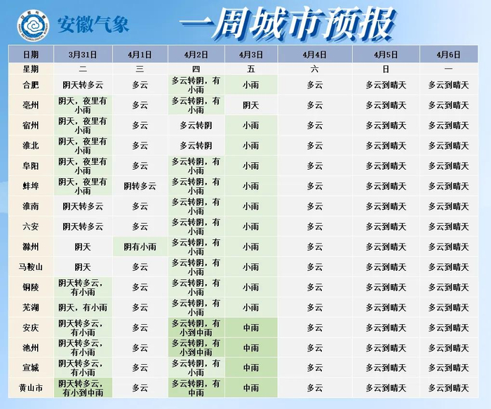 4月1日(周三):全省多云,江淮之间东部部分地区有小雨。