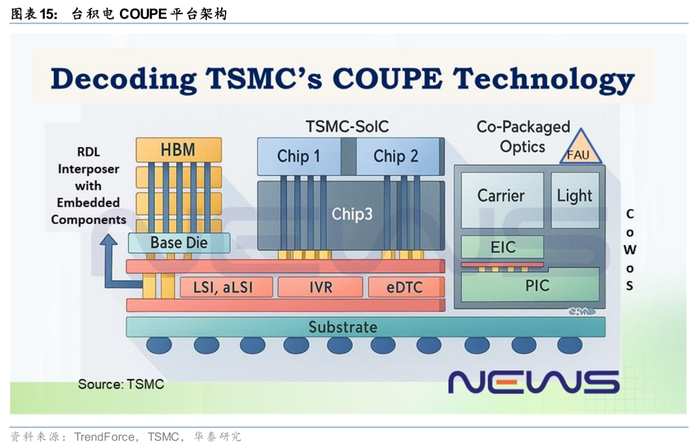 现阶段,台积电的COUPE平台是CPO最核心的产业化支撑之一,将EIC和光PIC通过更紧密的方式整合在一起,进一步缩短距离、降低寄生效应、提升吞吐量。此外,GlobalFoundries基于45nm RF SOI打造标准化硅光平台,侧重数据中心光互连与规模量产;Tower依托PH18/SiPho工艺,强化III-V材料异质集成与定制化服务,聚焦高速光通信与传感应用。