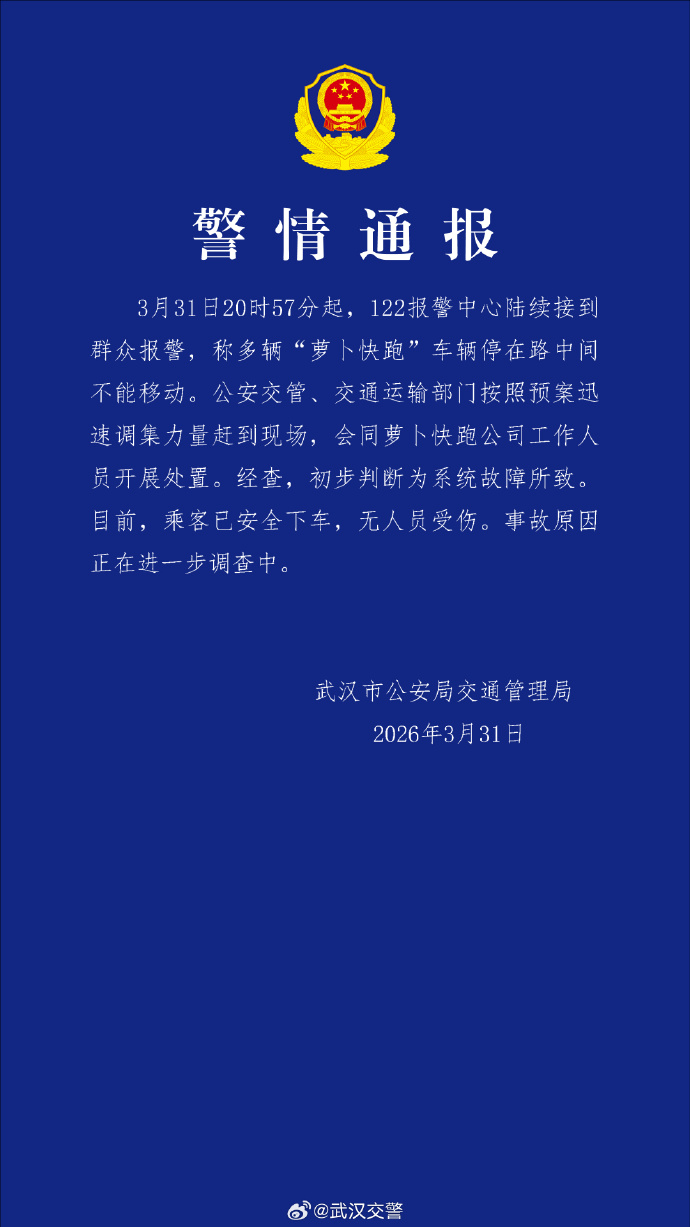 4月1日凌晨,武汉交警通报:3月31日20时57分起,122报警中心陆续接到群众报警,称多辆“萝卜快跑”车辆停在路中间不能移动。公安交管、交通运输部门按照预案迅速调集力量赶到现场,会同萝卜快跑公司工作人员开展处置。经查,初步判断为系统故障所致。目前,乘客已安全下车,无人员受伤。事故原因正在进一步调查中。