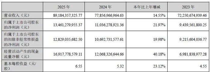 阳光电源3月31日盘后发布2025年年报,公司2025年实现营收约891.84亿元,同比增长14.55%;实现归属于上市公司股东的净利润约134.61亿元,同比增长21.97%;实现扣非净利润约128.29亿元,同比增长19.98%;基本每股收益6.55元,同比增长23.12%。公司拟以剔除回购专用证券账户中已回购股份后的股本为基数,向全体股东每10股派发现金红利6.9元(含税)。