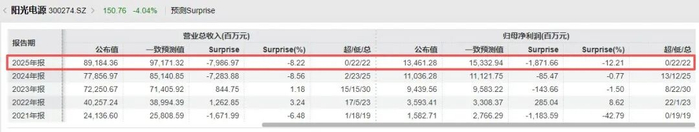 据万得金融终端汇编的数据,22家机构对阳光电源2025年的营收和归母净利润的一致预测值分别约为971.71亿元和153.33亿元。因此,从阳光电源披露的业绩来看,双双不及分析师一致预期,公司营收和归母净利润的公布值分别较机构一致预期低了8.22%和12.21%,且营收和归母净利润低于所有22家机构的预测值。