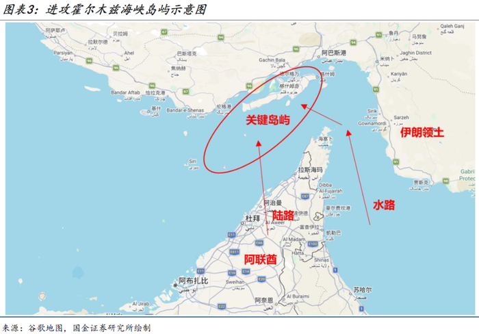 控制海峡的关键是海峡西侧的几个重要岛屿,包括格什姆岛、阿布穆萨岛、大/小通布岛。如果走水路,在经过海峡东侧时会路过伊朗领土,面临被攻击的风险。如果走陆路,虽然可以直抵海峡西侧,需却要借助阿联酋等海湾国家的领土甚至两栖船,可能被伊朗认定为介入战争。伊朗议会发言人近日称,“情报显示伊朗的敌人正计划在一个地区国家的支持下占领伊朗的一个岛屿,若对方采取任何行动,伊朗将攻击该地区国家的关键设施”。考虑到阿联酋在阿布穆萨岛和大/小通布岛与伊朗存在领土争议,被卷入其中是有可能的。