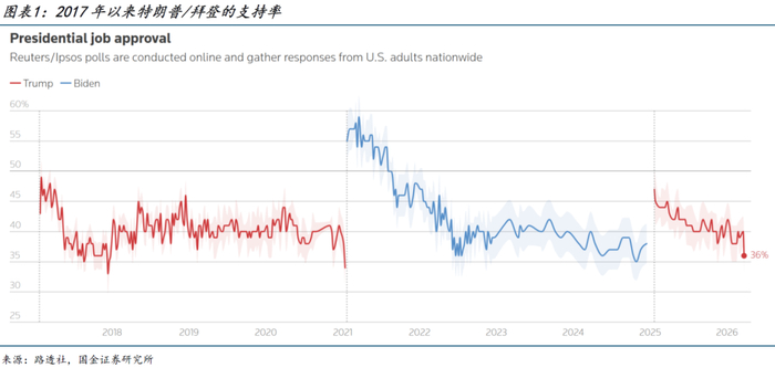 时间不在特朗普这边。油价上涨已经严重冲击了特朗普的选情,路透/益普索的最新民调显示,特朗普的支持率大幅下降至36%,创下第二任期以来的新低,持平于2020年大选共和党被横扫、2024年大选民主党被横扫之前的水平。Polymarket显示共和党在今年中选被横扫的概率上升至50%左右,至少丢失众议院几乎是板上钉钉。战争每持续一天,海峡每封锁一天,原油供需缺口就增加上千万桶,油价随时间升高,特朗普的境遇愈发不利。