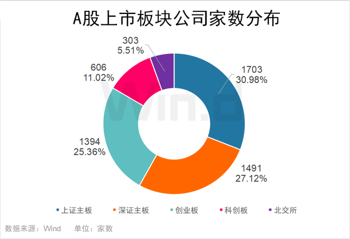 截至2026年一季度末,上证主板的上市公司家数最多,为1703家,占比达30.98%;深证主板紧随其后,共有1491家上市公司,占比27.12%;创业板、科创板分别有1394家、606家上市公司,占比分别为25.36%、11.02%;北交所上市公司数量最少,共303家,占比5.51%。