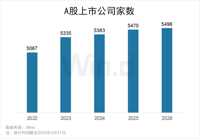 截至2026年一季度末,A股市场共有5496家上市公司,较2025年末增加26家公司。