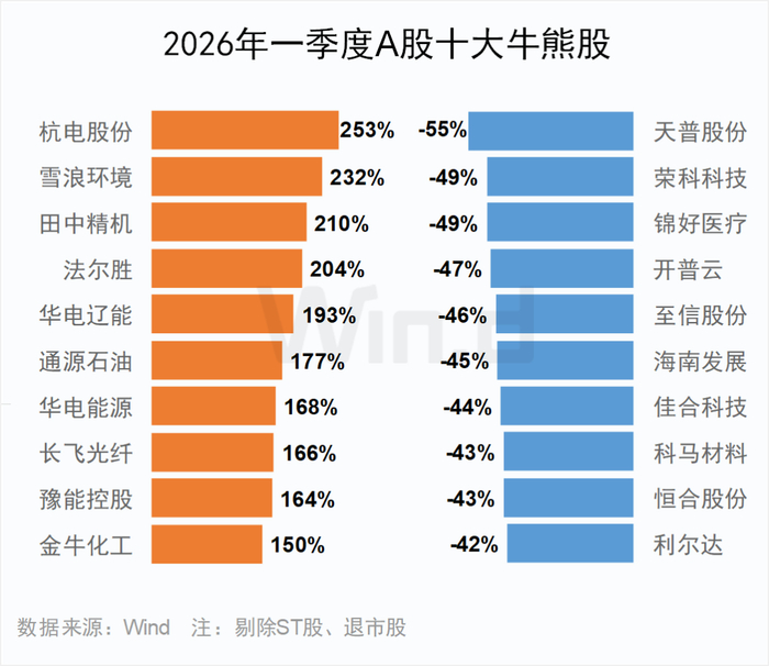 2026年一季度,杭电股份累计涨幅达253%居首,雪浪环境紧随其后,累计涨幅为232%,田中精机累计涨幅为210%;天普股份累计下跌55%居跌幅榜榜首,荣科科技、锦好医疗累计跌幅均达到49%。