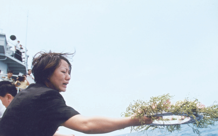 海祭仪式上,阮国琴把亲手制作的花环送进大海,告别王伟