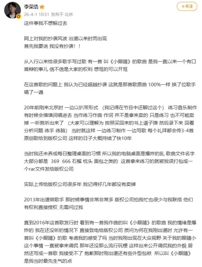 李荣浩发文否认抄袭!称《小眼睛》这首歌自己“有口难辩”