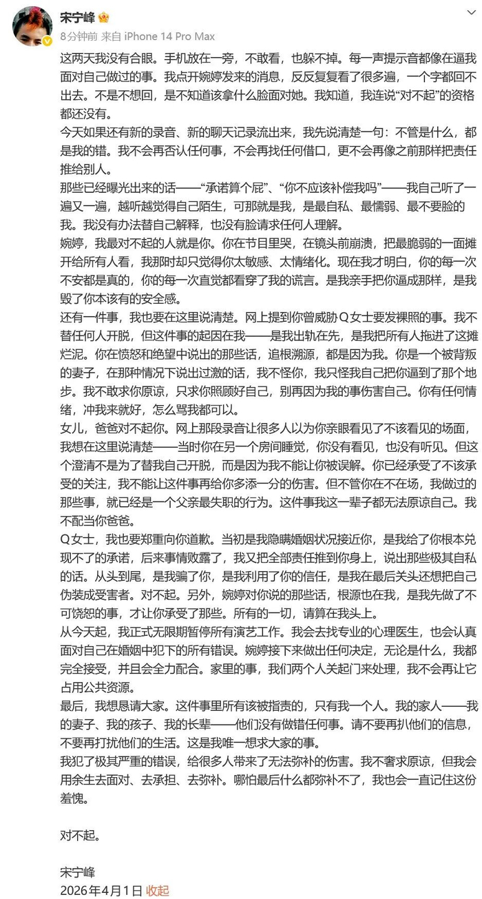 4月1日,演员@宋宁峰 发长文回应出轨,向张婉婷、女儿以及Q女士道歉,并宣布无限期暂停所有演艺工作,详情如下: