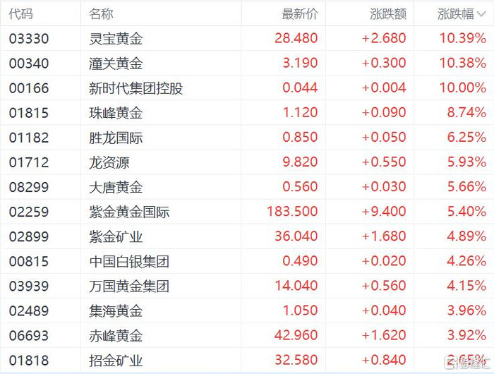 港股市场中,灵宝黄金、潼关黄金双双涨超10%领涨黄金及贵金属板块,珠峰黄金涨超8%,紫金黄金国际、大唐黄金、龙资源涨超5%,紫金矿业、集海黄金、赤峰黄金、招金矿业跟涨。