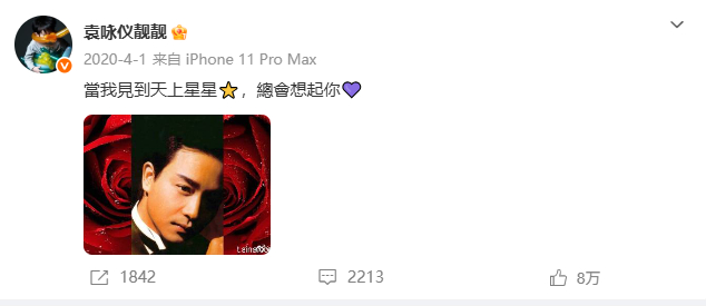 4月1日凌晨,演员袁咏仪在社交媒体发布动态,怀念张国荣。