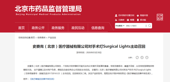 史赛克(北京)医疗器械有限公司报告,个别批次的拱腹环可能无法充分支撑天花板罩的重量,导致顶盖移动,暴露天花板,从而导致落屑等异物颗粒污染。出于谨慎以及对用户负责,德国百合股份两合公司发起主动召回。史赛克(北京)医疗器械有限公司对其生产的手术灯Surgical Lights(注册或备案号:国械注进20172016123 )主动召回。召回级别为二级。涉及产品的型号、规格及批次等详细信息见《医疗器械召回事件报告表》。