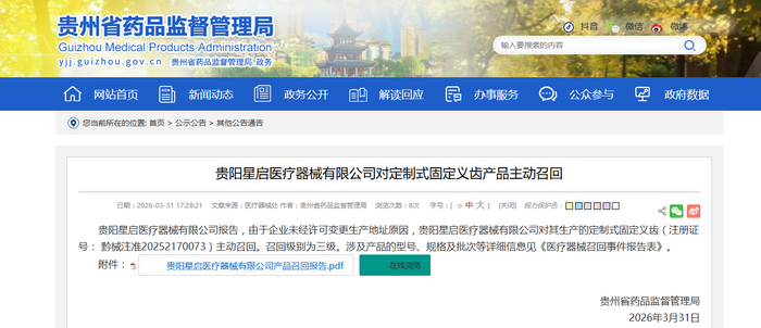 贵阳星启医疗器械有限公司报告,由于企业未经许可变更生产地址原因,贵阳星启医疗器械有限公司对其生产的定制式固定义齿(注册证号: 黔械注准20252170073)主动召回。召回级别为三级。涉及产品的型号、规格及批次等详细信息见《医疗器械召回事件报告表》。