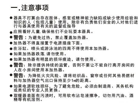 4.使用室内加热器之前,需仔细阅读使用说明书,关注警告语。严格按照说明操作使用。