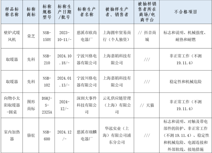 近期,市市场监管部门对本市生产、销售的室内加热器产品质量开展监督抽查,共抽查产品50批次。经检验,发现不合格产品5批次。不合格项目涉及标志和说明、非正常工作、稳定性和机械危险、对触及带电部件的防护、机械强度、电源连接和外部软线、接地措施、耐热和耐燃等。对检验结论为不合格的产品,市场监管部门已依法依规对本市经营者开展处理,依法查处违法行为,并通报生产者所在地市场监管部门。