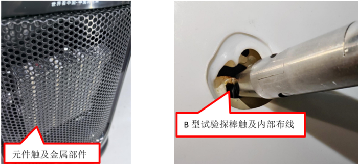• 试验中,器具发热元件的支撑架熔化,发热元件触及易触及的金属部件;外壳熔化,导致B型试验探棒可触及仅有基本绝缘防护的内部布线,存在触电风险。