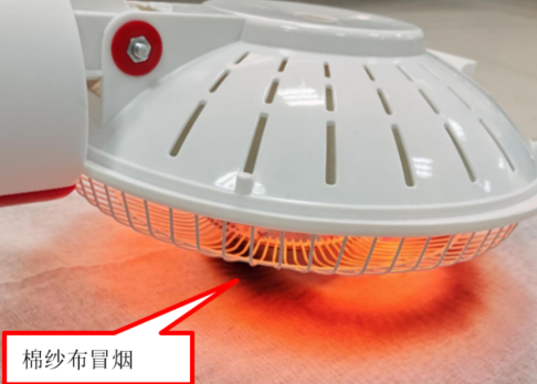 • 试验中,将器具以最不利的位置翻倒,翻倒后出现棉纱布冒烟的情况,可能引燃周边可燃物,进而引发火灾。