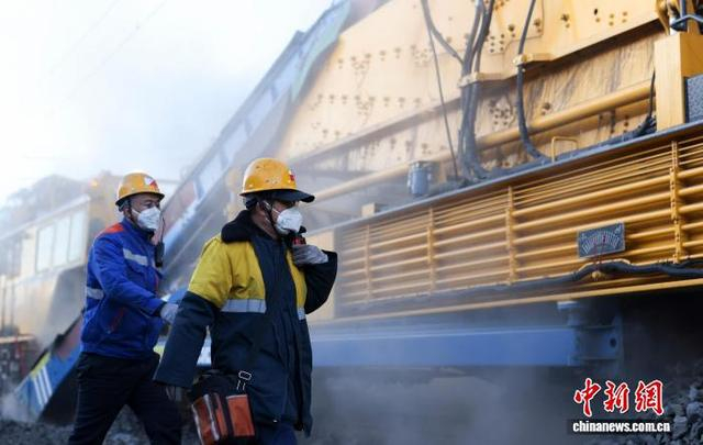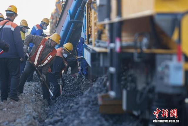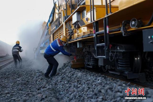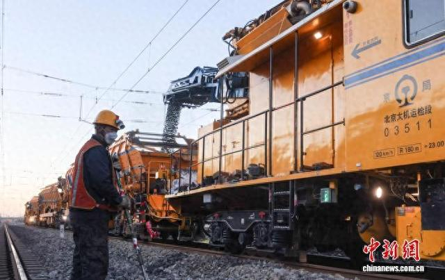 4月1日晨曦时分,国铁北京局北京大型养路机械运用检修段的作业队伍在京沪线铁路黄村火车站附近开展清筛作业。中新社记者 贾天勇 摄