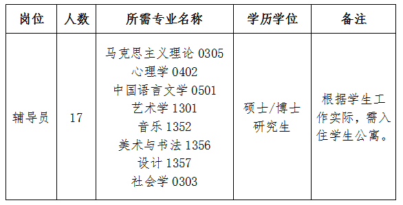 根据学校实际工作需要,经研究决定,2026年公开招聘专职辅导员17名,具体事项公告如下: