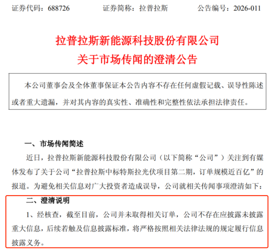 然而,拉普拉斯午间火速发布澄清公告称,经核查,截至目前,公司并未取得相关订单,公司不存在应披露而未披露的重大信息,后续若触及信息披露标准,将严格按照相关法律法规的规定履行信息披露义务。