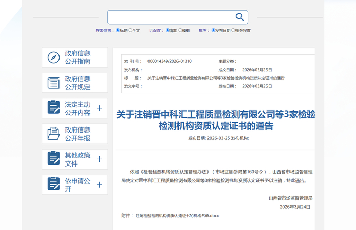 关于注销晋中科汇工程质量检测有限公司等3家检验检测机构资质认定证书的通告