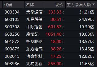 个股方面,天孚通信获得逾31亿元主力资金净流入,永鼎股份获得逾24亿元净流入,中际旭创、寒武纪、招商轮船等6股也获得超10亿元净流入。