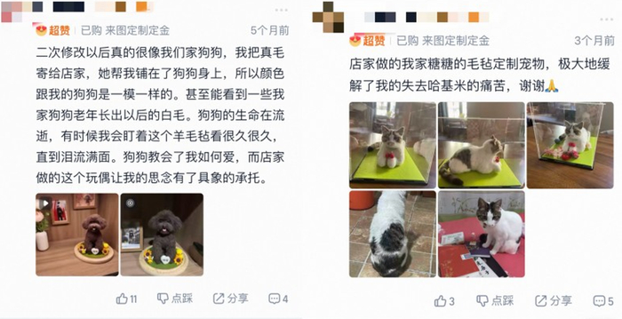 据介绍,平台上不仅有前沿的数字技术延续爱意,还有许多充满温度的手作店铺,用一针一线帮铲屎官留住温情。十三年前,琴姐在淘宝开了一家名为“御姐屋毛毡手艺”的店铺,一针一针地戳出宠物仿真羊毛毡,把爱宠的模样永久定格。
