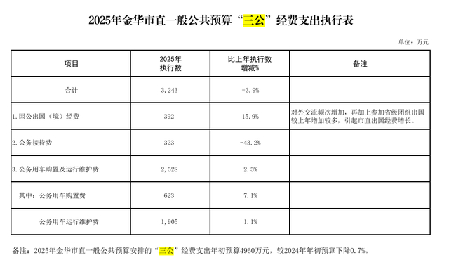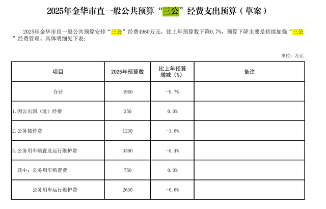 2025年金华市直一般公共预算“三公”经费支出预算为4960万元,但2025年金华市直一般公共预算“三公”经费支出执行仅为3243万元,执行数为预算数的65.4%。如此可见,2026年金华市“三公”预算为4950万元,在去年预算基础上减少了10万元,在实际执行中形成的刚性约束并不大。