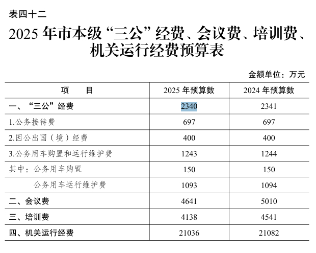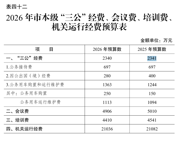 同样,在《宿迁市2025年预算执行情况和2026年预算草案》中,2026年预算数是2340万元,比2025年预算数2341万元少了1万元。但在《宿迁市2024年预算执行情况和 2025 年预算草案》中,2025年预算写的是2340万元,相比2024年2341万元少了1万元。也就是说,宿迁市通过在2025年下半年调整增加“三公”预算1万元,创造了2026年压减1万元的账面,但实际上2026年预算和去年年初预算持平。